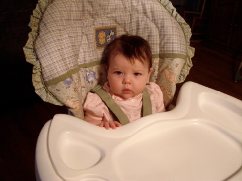 The nurse sent home a little pamphlet about month four–it started with a reminder that we should wait to start solids until six months. I confessed to starting them “a few days ago.”