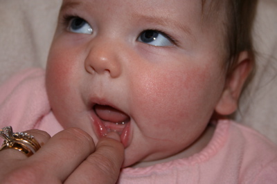 Olivia’s getting her first tooth! I felt it on Friday, and one corner was visible last night. This morning, you can see the entire top. I don’t recall how long it takes to fully emerge, but I do hope it goes quickly. It’s making her a bit crabby!