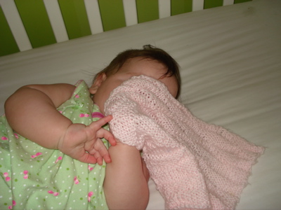 Olivia’s Aunt Debbie had a great solution–she made her two small blankets with a very loose knit. They’re soft but completely breathable, so she can keep them all night. Livie loves them!
