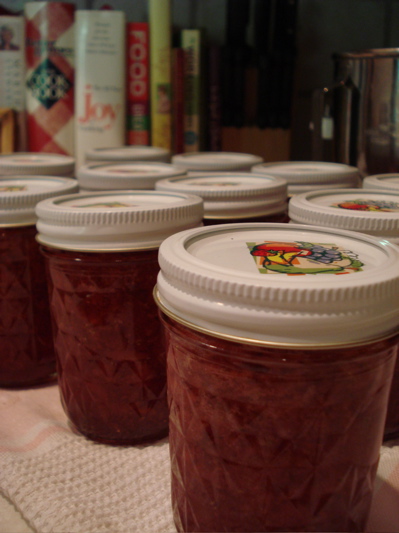 Eight pounds of fruit, 21 cups of sugar and a few hours later, I have two dozen jars of strawberry jam. If I had any more time on my hands, this could be a dangerous hobby.