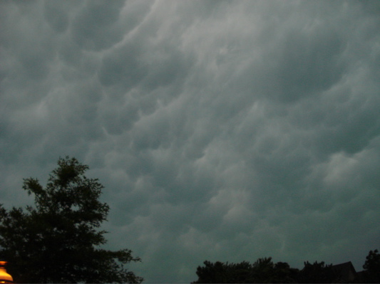 This line of storms has formed a bow echo–a curve like an archer’s bow–due to the winds behind the storm. A bow echo usually means significant wind damage and is often associated with tornadoes.