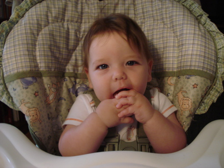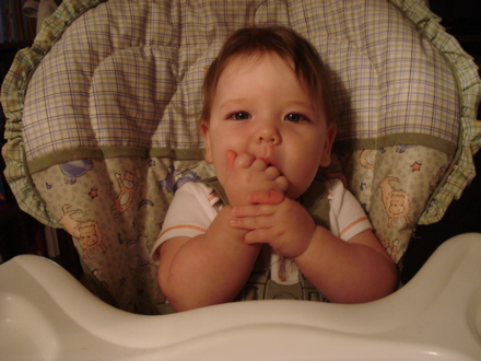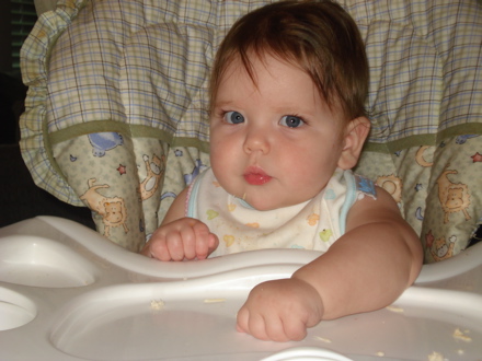 We recently started giving Olivia little bits of food to feed herself, not necessarily because we felt she was ready, but because we can’t seem to feed her fast enough. So, this gives her something to do while we prepare the next bite. And, fortunately, she does actually seem to do pretty well.