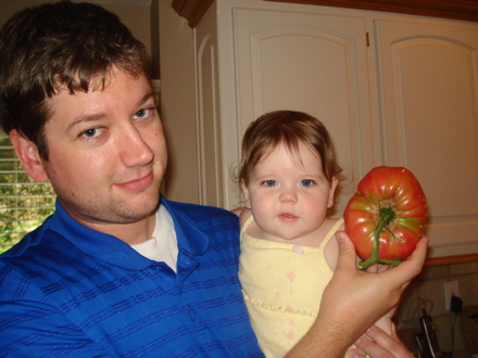 We found a huge tomato growing in the center of the vine. We noticed it was about the size of Olivia’s head!