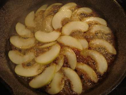 Then, you arrange apple slices in the pan and cook over medium heat for eight minutes.