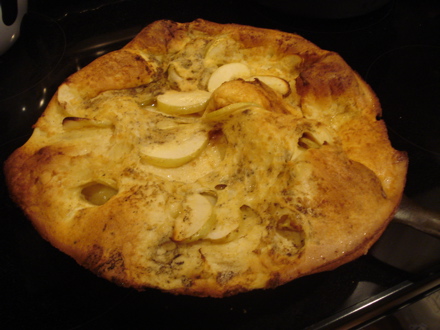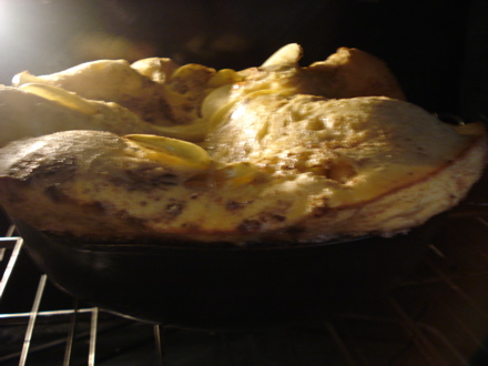 The batter (which you gently pour over the apple arrangement) puffs as you bake it, as you can see in this foggy oven photo.
