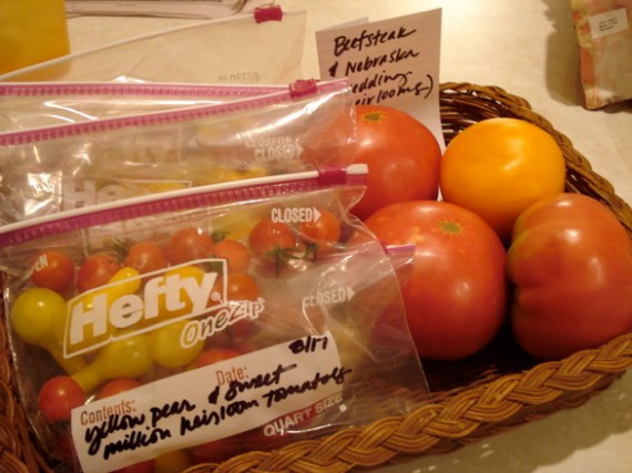 One of my favorite things about having a garden again is sharing–or better yet, trading–the proceeds with friends. I took in a basket of tomatoes and some basil into work on Monday. The tomatoes (Brandywines, not Beefsteaks) were gone in five minutes!