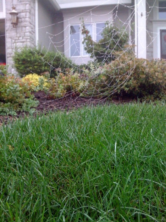 Bry snapped this photo outside this morning as I was leaving. The web is anchored from points about six feet apart. It looked incredible covered with dew.