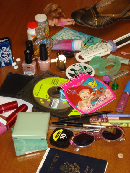 That’s right–two compacts, crayons, Dora the Explorer sunglasses, a measuring tape (hi, Mom!), an empty container of mints and its stray, lint-covered belongings, perfume, a teether, lip gloss I’ve never worn, and a pair of flats.