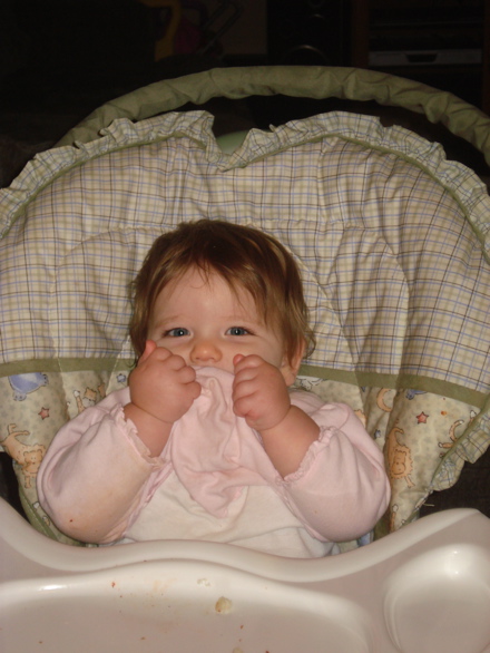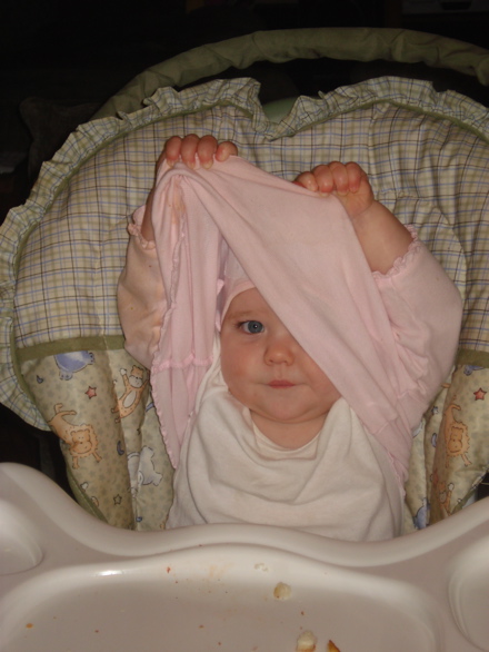 Is she playing peek-a- boo, or trying to take her shirt off? She is so adorable – and yes, the spitting image of her adorable Mommy!
