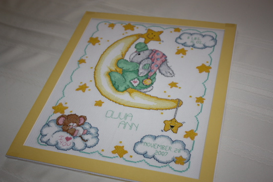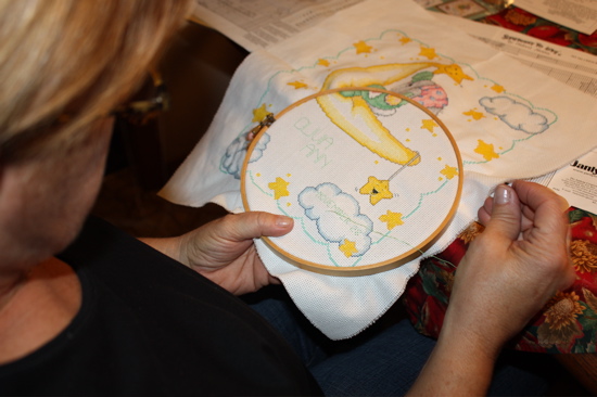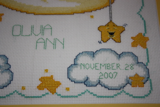 My mom makes a cross-stitched birth sampler for all of her grandchildren, aiming to have them complete by their first birthday. She was a bit behind on Olivia’s, finishing it up the day before her second birthday. This was to my benefit, as I was able to see and photograph her at work.