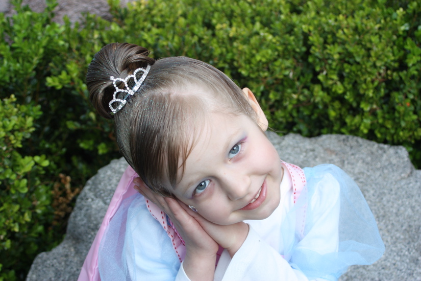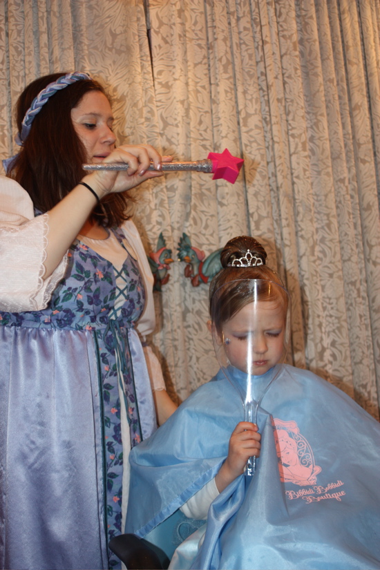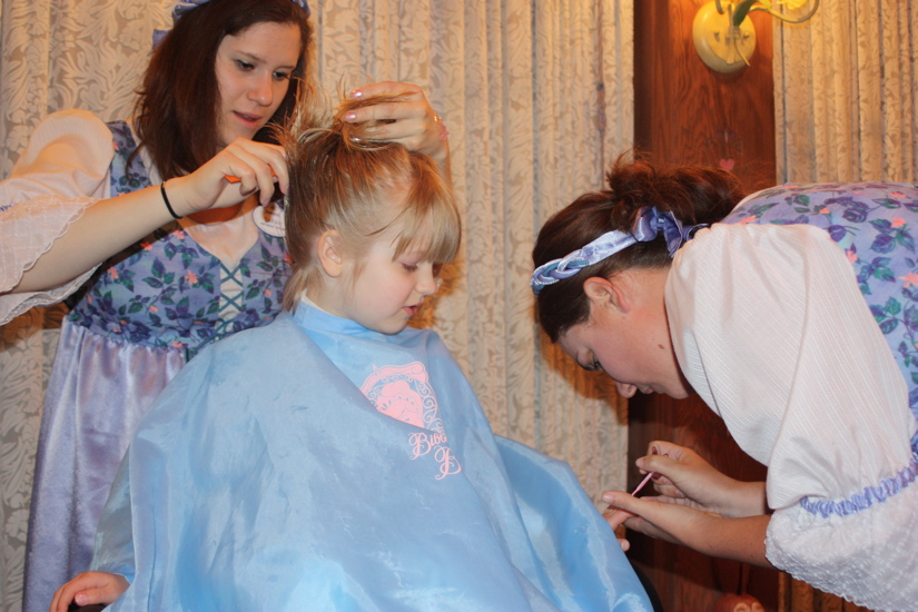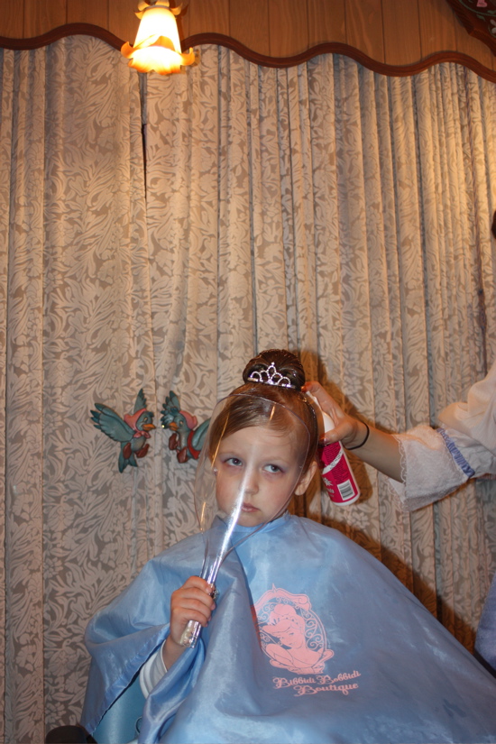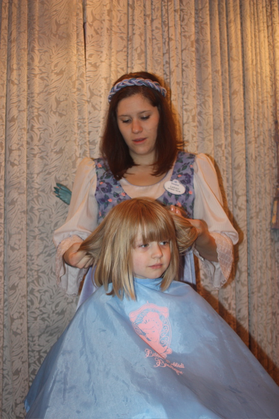 So, early that Thursday morning, we pulled out the Cinderella costume and Ava and I headed into the park. A godmother-in-training whisked her over to a salon chair and began task of piling her short blond bob into a neat little bun on the very top of her head. (Ava had the choice of three hairstyles, and I held my breath until she passed up the “Miley Cyrus,” opting instead for the “Classical Princess.”)