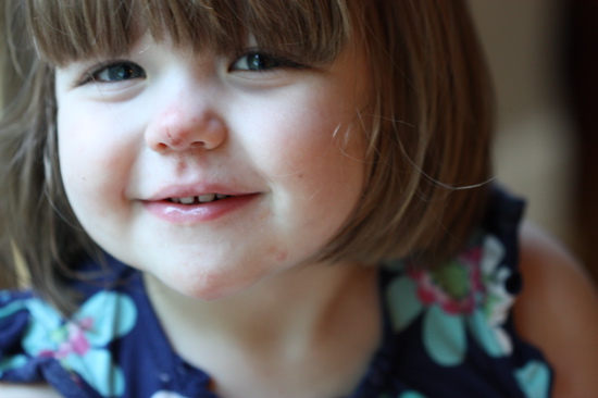 Apparently, Olivia managed to scrape her entire nose. She covered all 180 degrees, in one solid scratch that missed her lips and continued under her chin.
