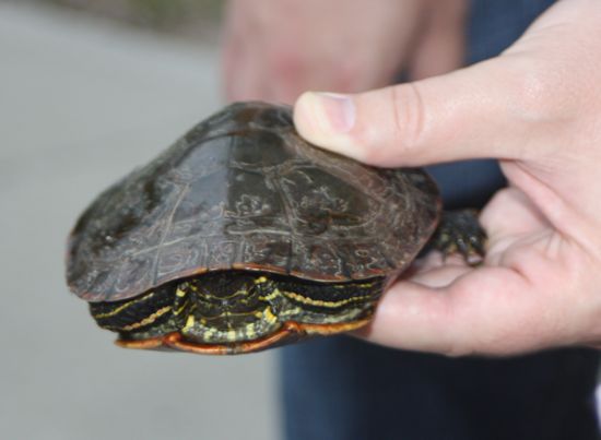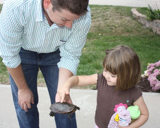 Olivia was the first one out the door this morning, and when she rounded the car, she started yelling, “Oh! Look, a turtle! GET IT, DADDY!”