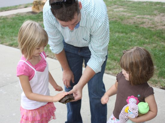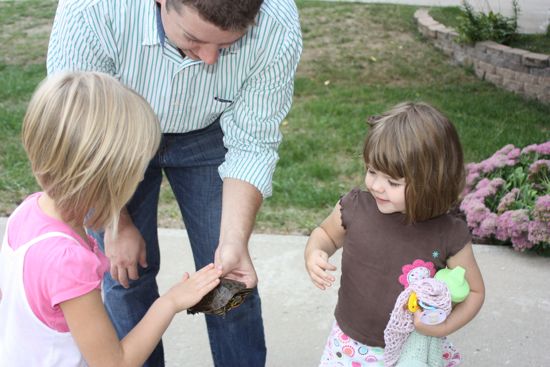 I have to admit I thought she had confused her animals, but she was right—there was a box turtle slowing making his way across the driveway. Bryan scooped him up so the girls could get a closer look.