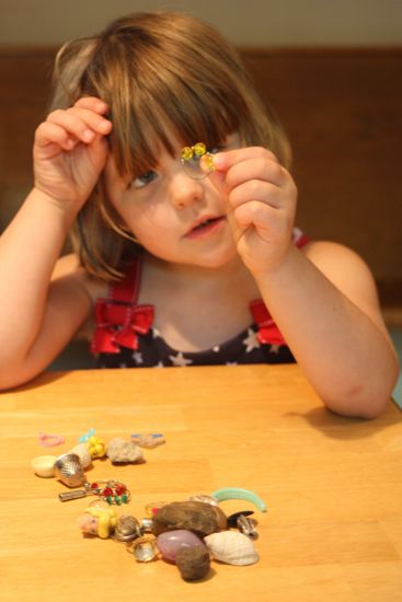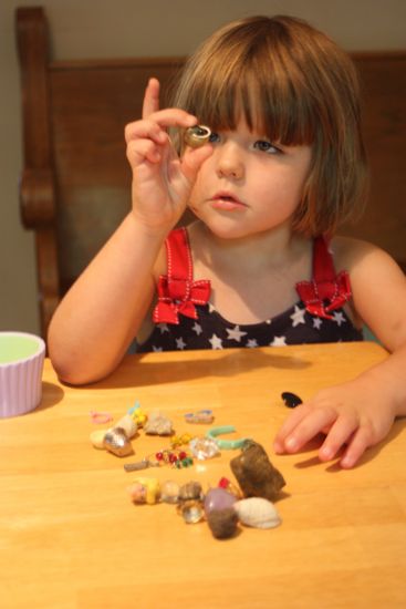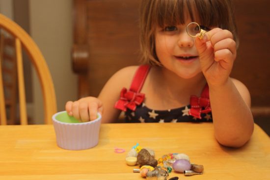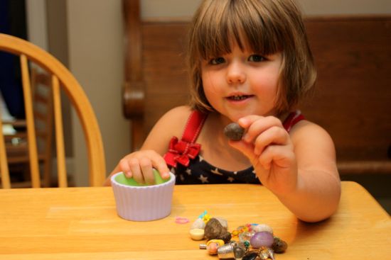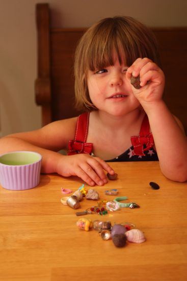 I keep a ceramic cupcake on the kitchen window sill, and it’s filled with little things we’ve collected around the house. Mostly, they are small items like Barbie shoes and crowns that used to pose a choking hazard for Olivia, but now, she loves to look through the container and show you everything she finds. There’s a pretty hilarious range, from rocks…