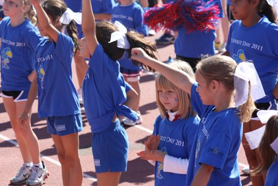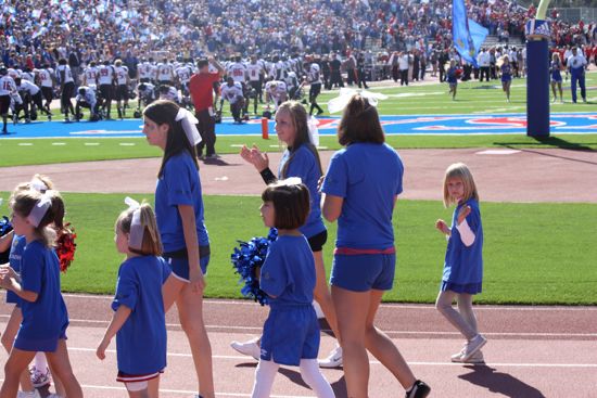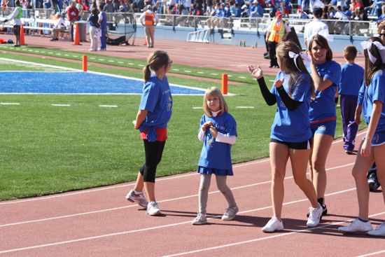 Each year, the KU spirit squad hosts a fundraiser. For about fifty bucks, you can send your little cheerleader down to the sidelines to cheer on the Jayhawks during a football game. One of Ava’s sitters cheers competitively at the high school level, and she invited Ava to participate. I thought she’d have a fabulous time—what’s not to love? Between the band and the mascots, not to mention about 40 other little girls, I was sure she’d have a blast.