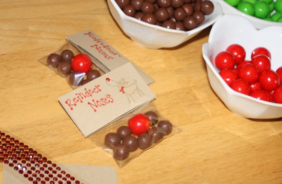 While the original Pin suggested a much more intricate label, I found an old reindeer stamp to work just fine. It took me quite a bit of time to find red “noses” to match the size of the malted milk balls, so I finally settled for larger gumballs. In the end, I think I like how that makes Rudolph’s nose stand out. At least that’s what I’m telling myself…