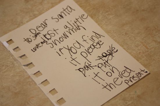 Then, later that same day, she searched frantically for a little missing snowman ornanament that was supposed to sit on top of this gift to her parents. She didn’t want to share too many details with us for fear of ruining the surprise, but she did leave this little note for Santa. It made my newly-enlarged heart sink: