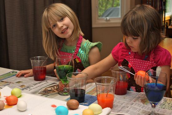 The second trick was using Kool-Aid to dye eggs. It was certainly easier than mixing vinegar and food coloring, though I will say I didn’t have quite the spectrum for which I was hoping. We stirred up green and blue the old fashioned way to expand the palette, and then the girls set to work.