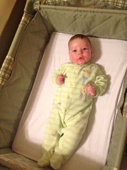 He’s one long baby, and he has more than outgrown the bassinet. I’m still not ready to move him to his own room, and so he’ll sleep next to me in a pack and play until he outgrows that. We should have at least four or five days, I think…