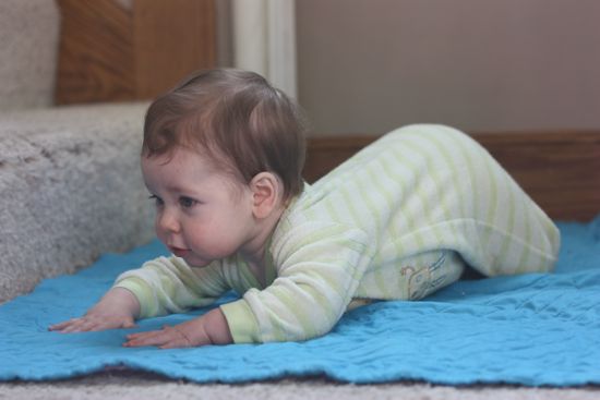 Owen reached the eight month mark on Sunday. No longer content to sit and snuggle, this baby is on the move. I sat him on the landing of the staircase to shoot a few photos of his new tricks, and it didn’t take long for him to express an interested in climbing down the stairs.
