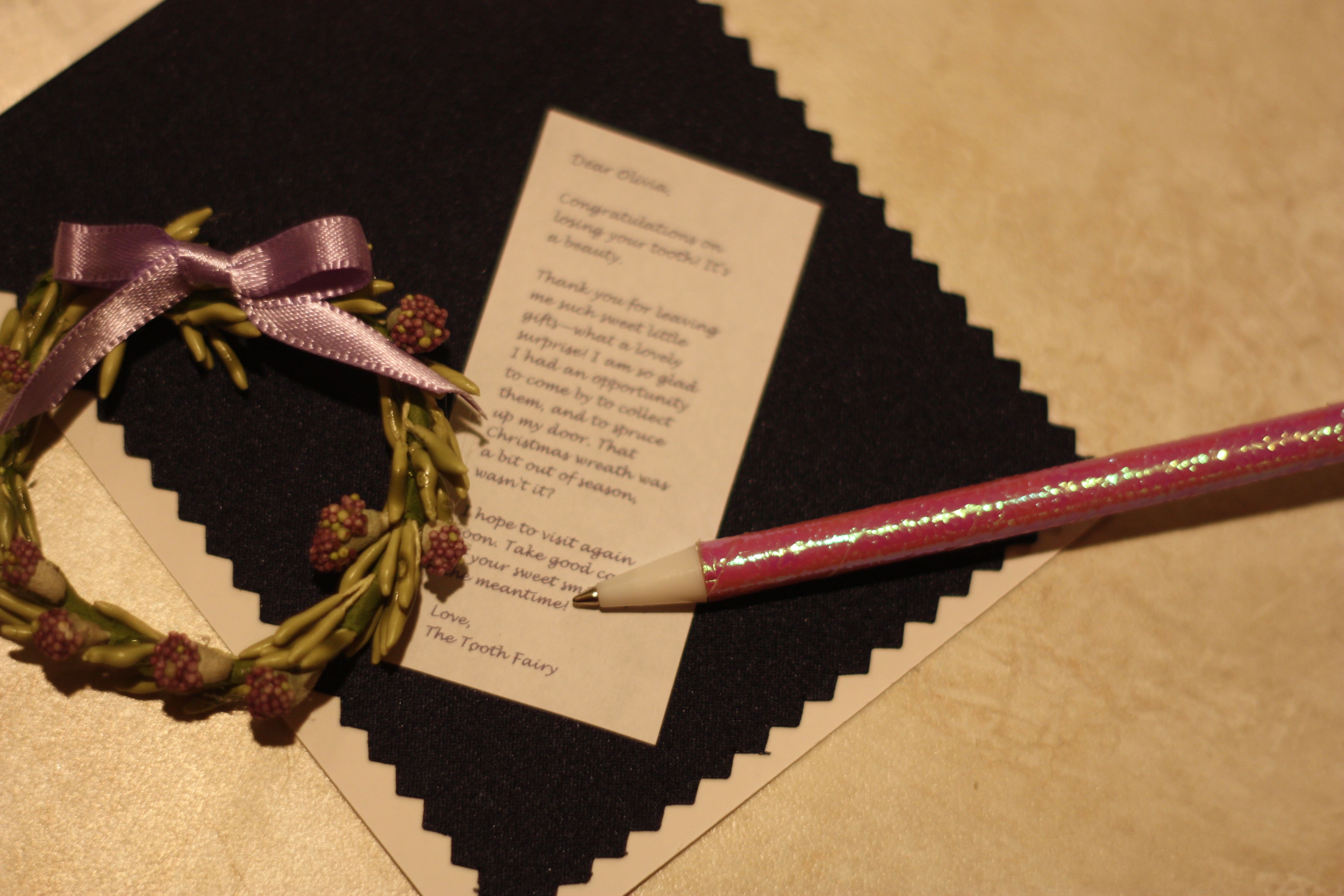 Olivia’s had a few loose teeth for quite a bit now, but one in particular has been the focus of late. Every day she’d mention it, asking if she could “slam it out.” Despite her tries, linking the tooth and the doorknob with a thin piece of floss did little to coax it out of it’s place. Last week, though, Bryan helped her twist it out, and the Tooth Fairy visited for the first time in quite a long while. She brought with her a tiny little note, a new wreath for her door, a stack of coins and a sprinkle of purple fairy dust.