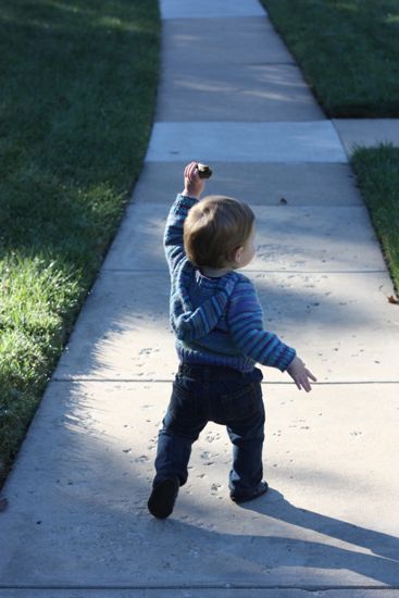 Owen’s most favorite pastime is strolling (running) up and down the sidewalk, where he will pick up a walnut or a rock or a piece of mulch, toss it ahead of himself, and then run after it. He repeats this up and down the path—the same one I walked over and over when I was in labor one night last summer.