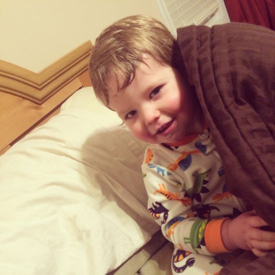 He climbs then purposefully falls from furniture, makes his way up the ladder to Livie’s bunk bed (“the ONE PLACE that was safe!”), then heads to the bathroom to run hot water into a tub that can’t be baby-proofed. He’d happily spend the day pretending to drive our cars, honking the horn until the neighbors go crazy. When he’s mad, he’ll grab and throw anything he can reach, then gingerly lower himself to the floor for a quick tantrum.