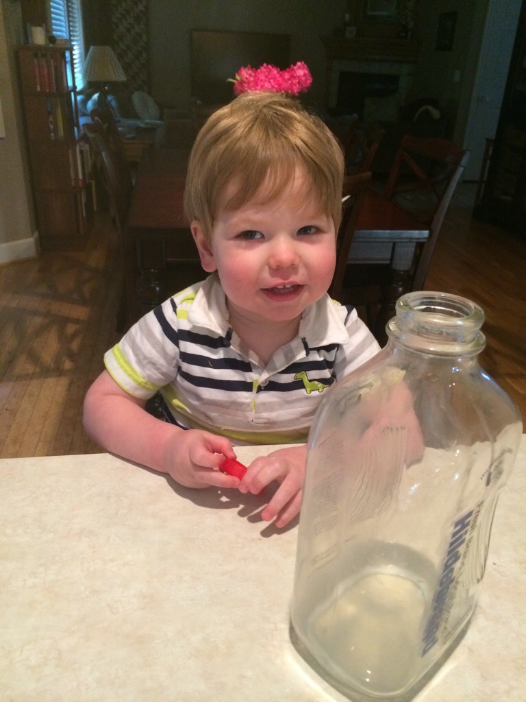 While heading toward you with a chair that will allow him access to something he’s not supposed to have: “E’cuse me, peas!”