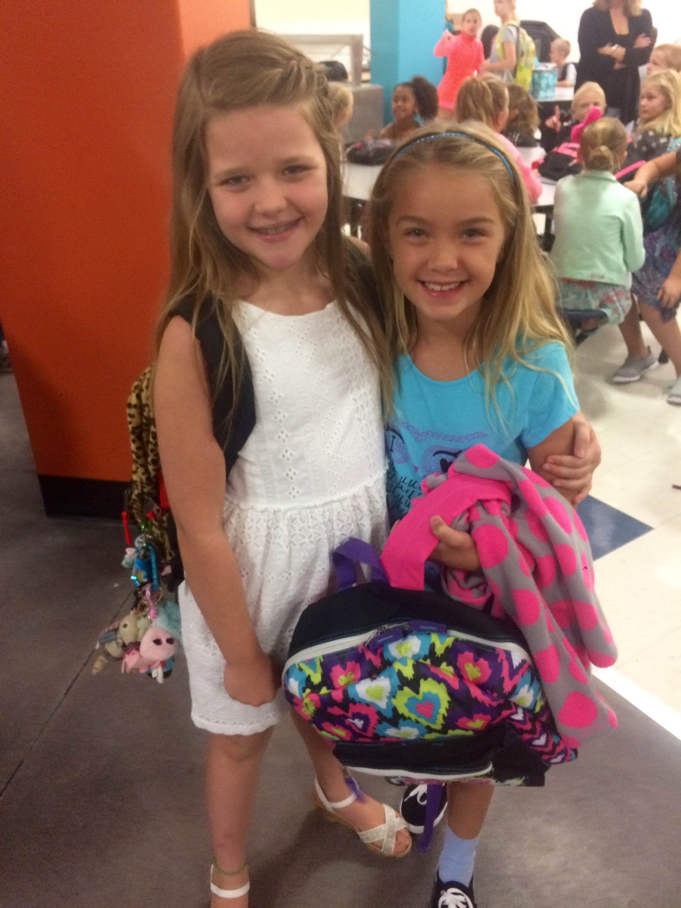 Olivia joined her second grade class with her typical enthusiasm–this kid truly loves school and all it brings. She tucked Sleeping Bunny into her (velour) backpack and immediately reconnected with her sweet friend first thing this morning.