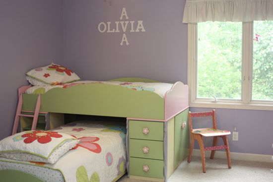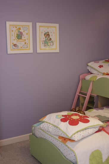 We finished painting and decorating the girls’ room this weekend. I have a tendency to go with the very last option on the paint swatch (why paint something purple when you can paint it PURPLE?) but Bryan talked me into a lighter shade of lavender. I’m really happy with the way it turned out.