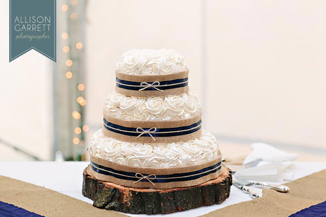 My step dad made the cake base, and my mom tailored the ribbon. I used pearl pins to adhere the tiny twine bows, then the groom and my father-in-law helped me transport the cake from the house to the tent via golf cart. I was more nervous during those five minutes than I was throughout my own wedding. The bride and groom cut the cake with Gramma’s cake knife, and there was just enough for the entire party.